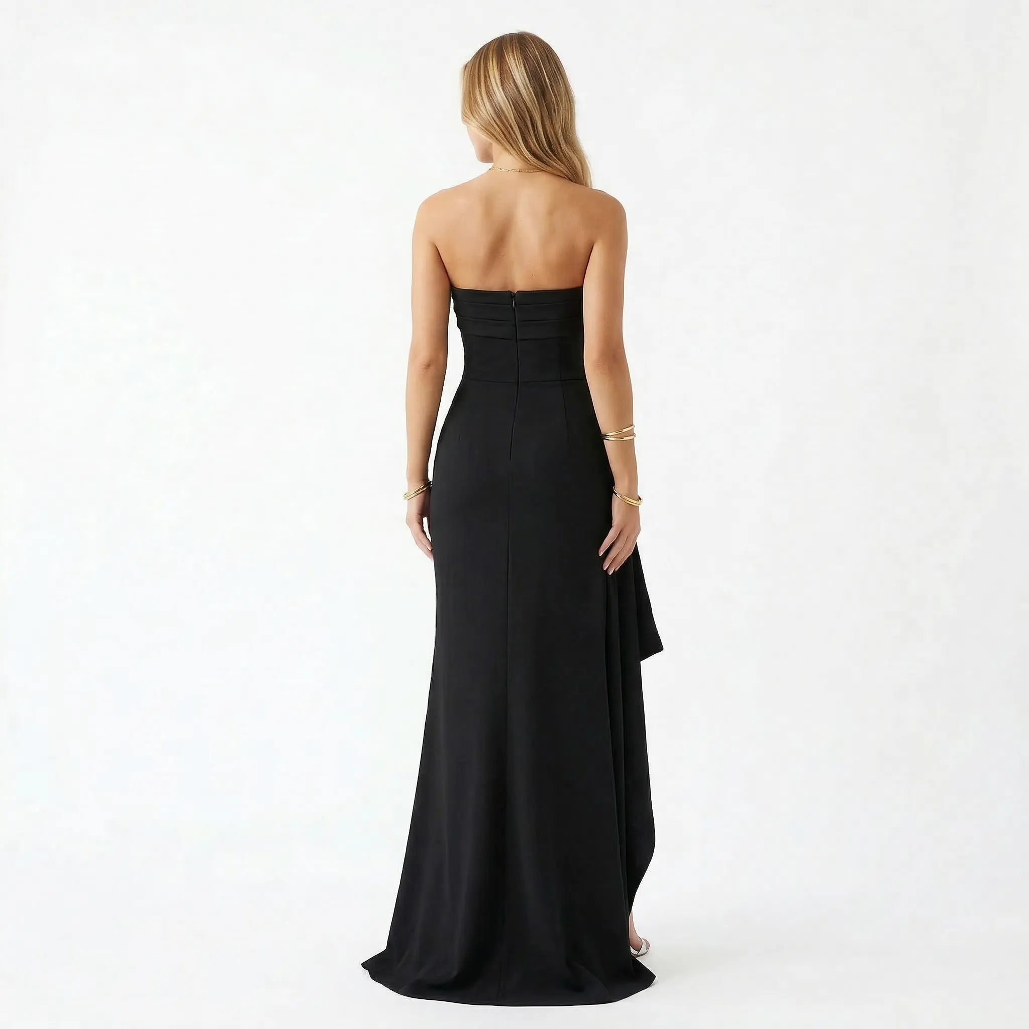 Sylwetka sukienki jest oszczędna i mocno zmysłowa — prosty, bezramiączkowy dekolt tuż nad biustem przechodzi w gładko dopasowany gorset. Poziome marszczenia na biuście i w talii tworzą subtelną fakturę, która modeluje linię tułowia, podkreślając krągłości bez dodatkowych zdobień. Góra zachowuje minimalistyczny charakter, stawiając na elegancję formy i zdecydowaną linię dekoltu.