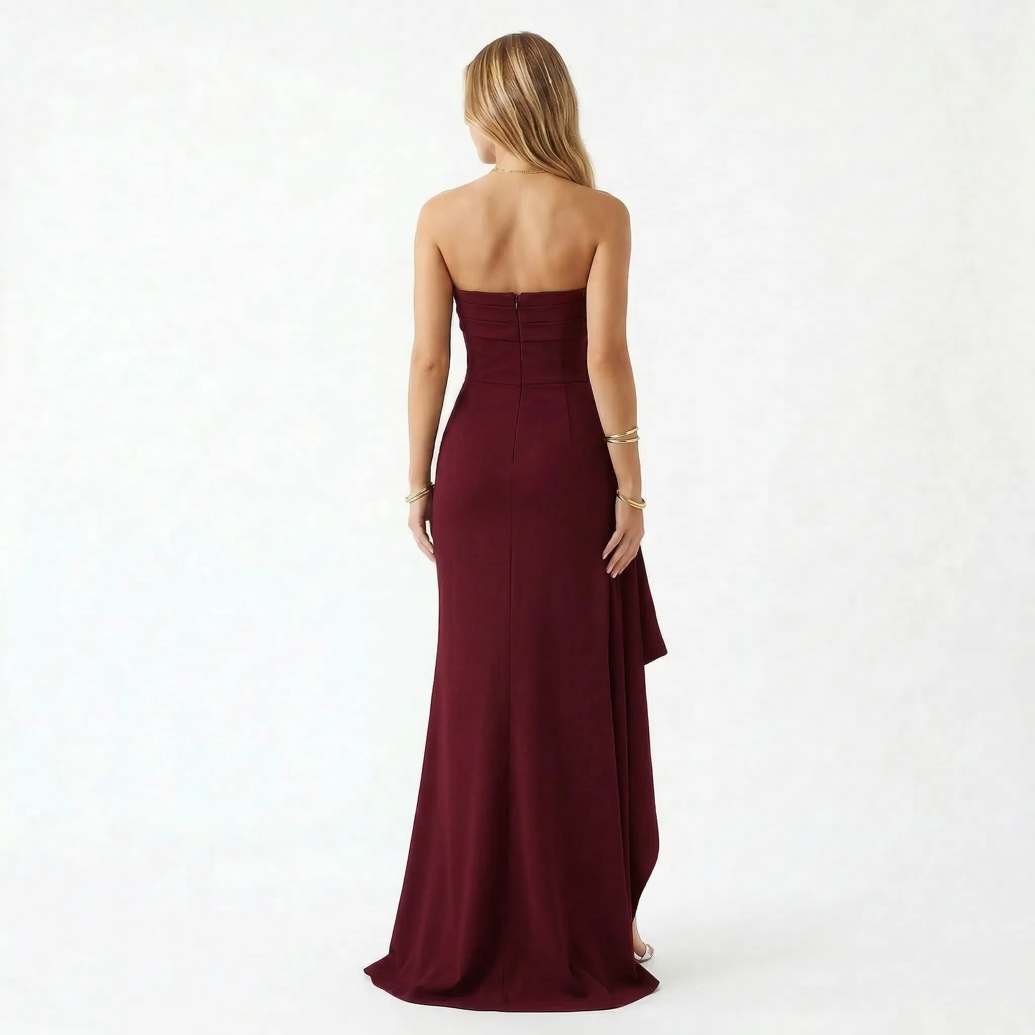 bez ramiączek, asymetryczne wysokie rozcięcie, dopasowany krój, długi fason, drapowanie, kolory bordowy, czarny