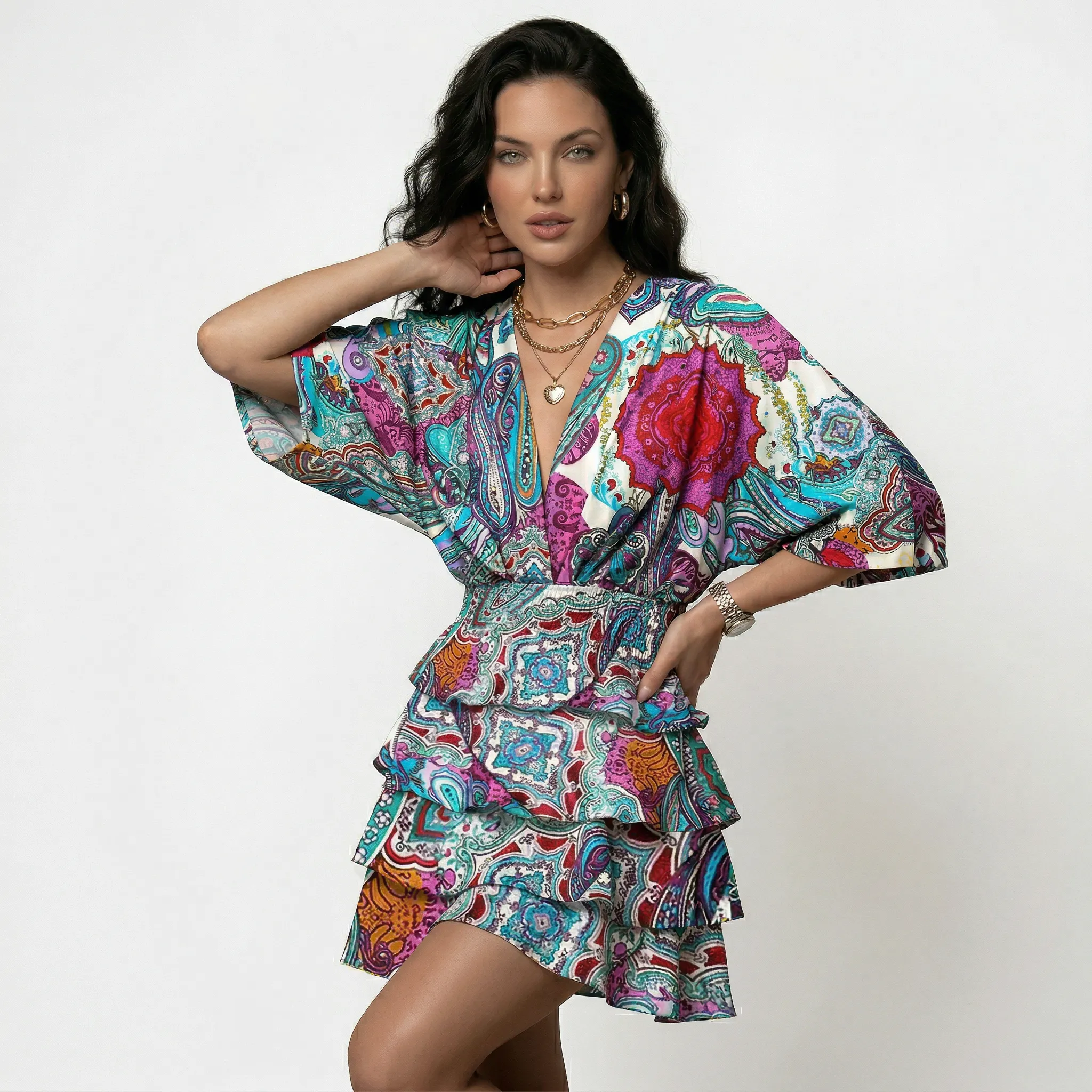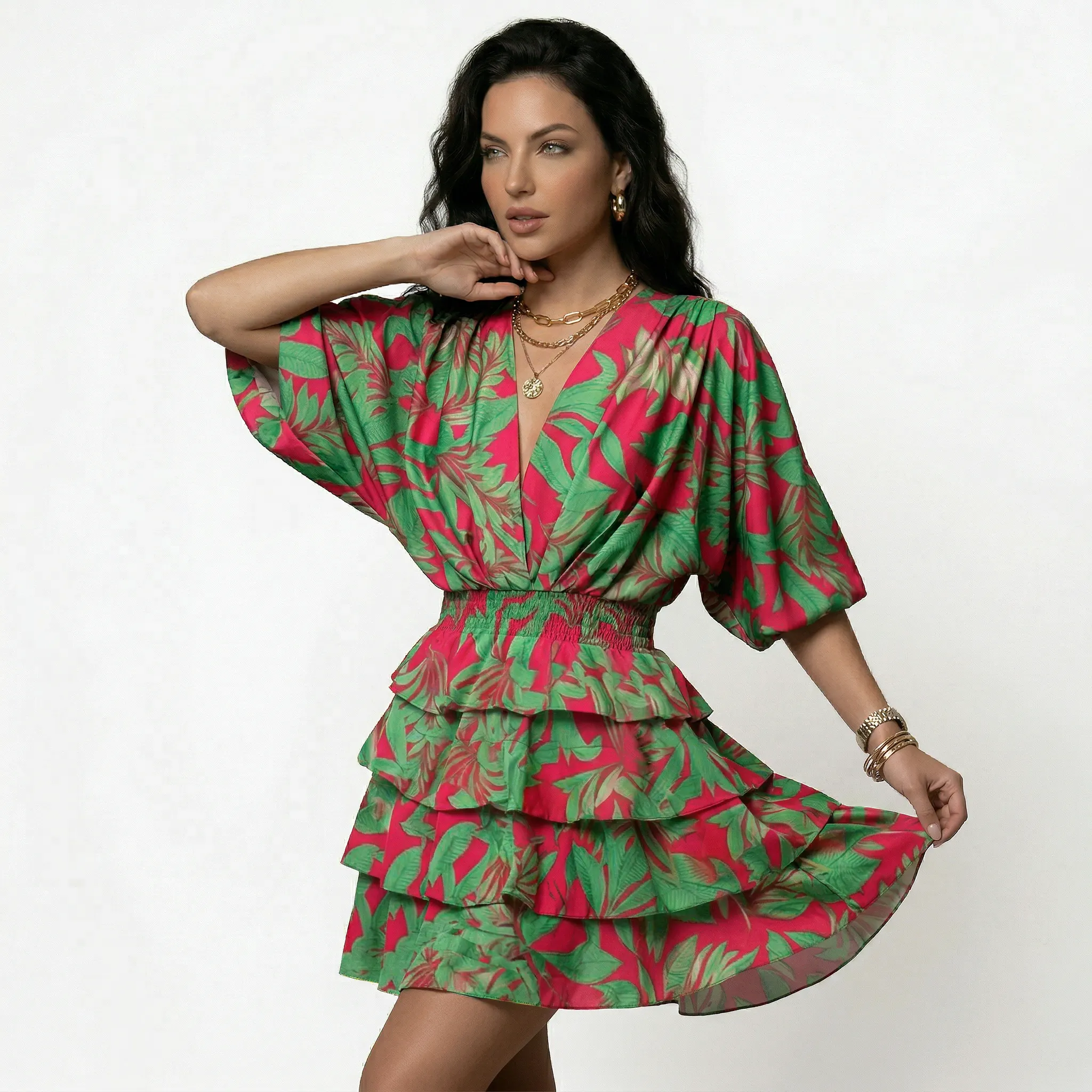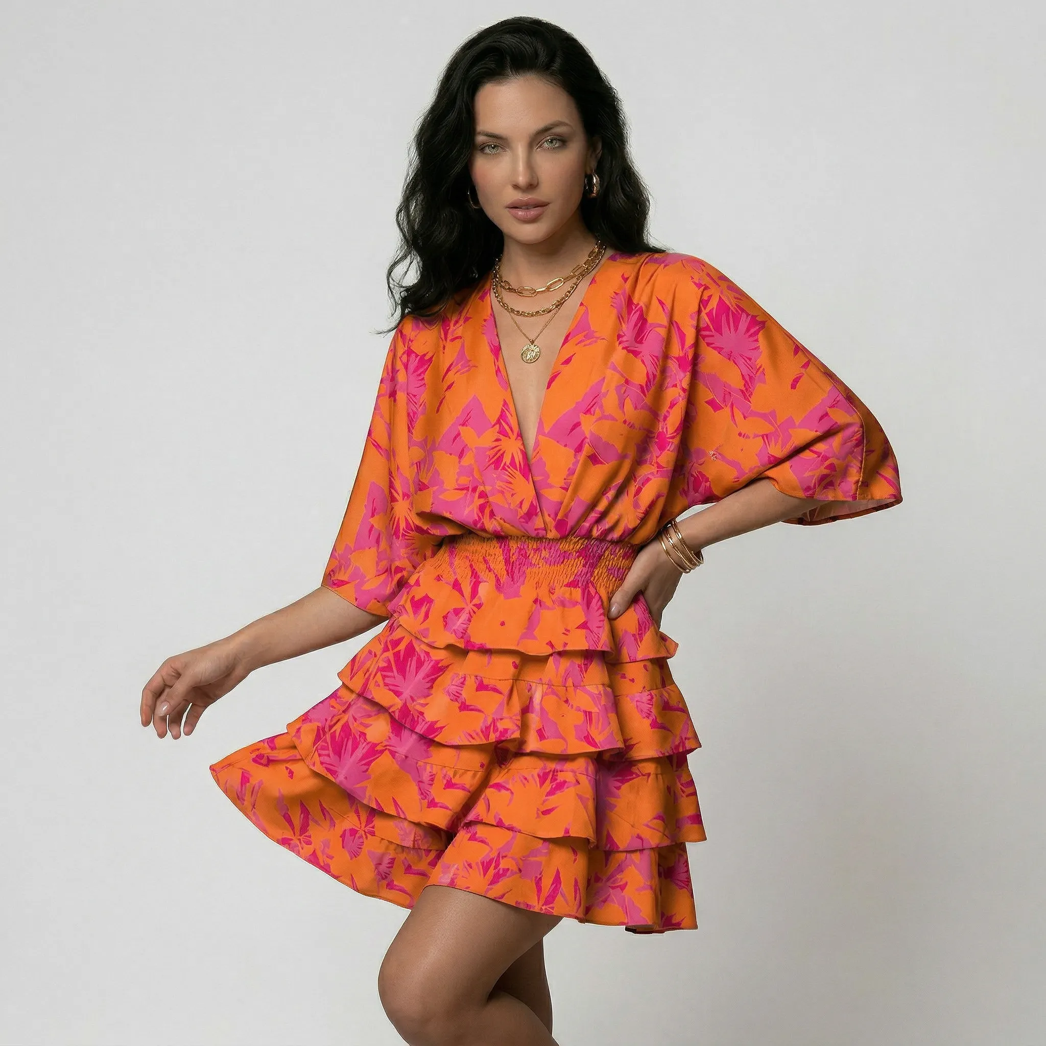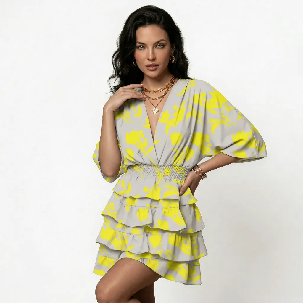 Kobieca sylwetka z wyraźnym akcentem na górę — sukienka ma kopertowy dekolt w kształcie litery V oraz luźne, szerokie rękawy nawiązujące do kroju kimono. Górna część układa się miękko, zbierając się w wyraźnie marszczony pas w talii, który modeluje linię ciała i podkreśla proporcje bez dodatkowych przeszyć.