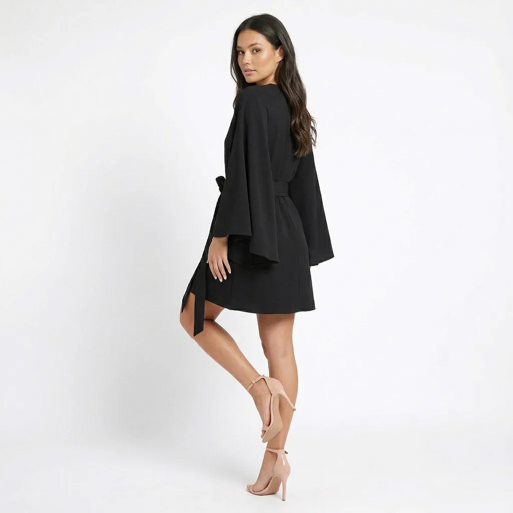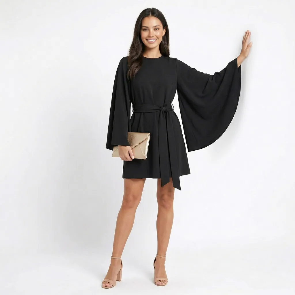 Krótka sukienka o minimalistycznej linii zyskuje teatralny akcent dzięki rozłożystym, kimono-podobnym rękawom przypominającym pelerynę. Prosty, okrągły dekolt i gładka góra z subtelnymi zaszewkami tworzą harmonijną, wysublimowaną formę, która skupia uwagę na geometrycznych konturach sylwetki.
