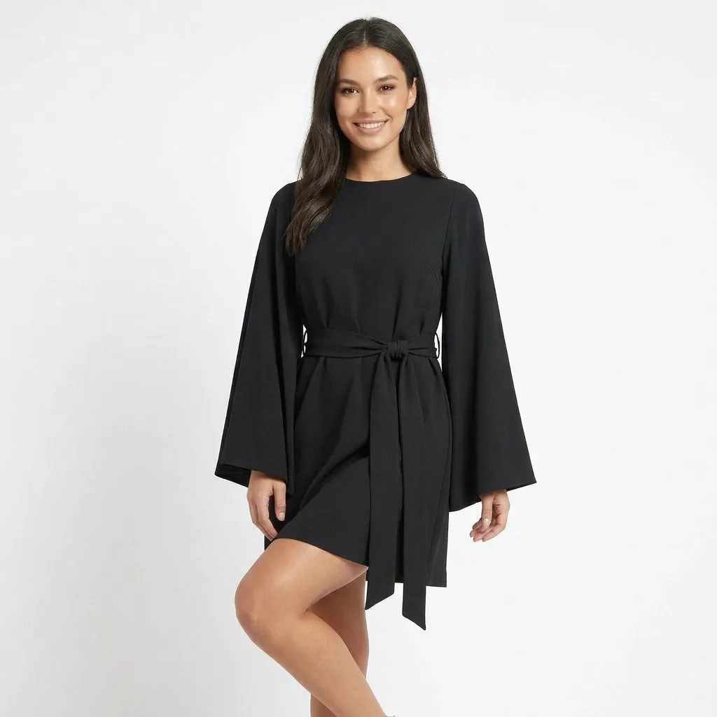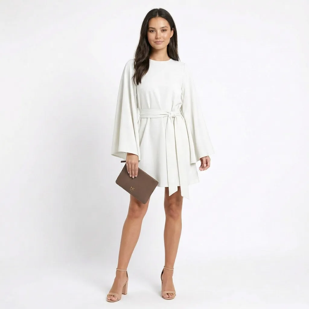 Sukienka z szerokimi rękawami kimono i wiązanym paskiem
