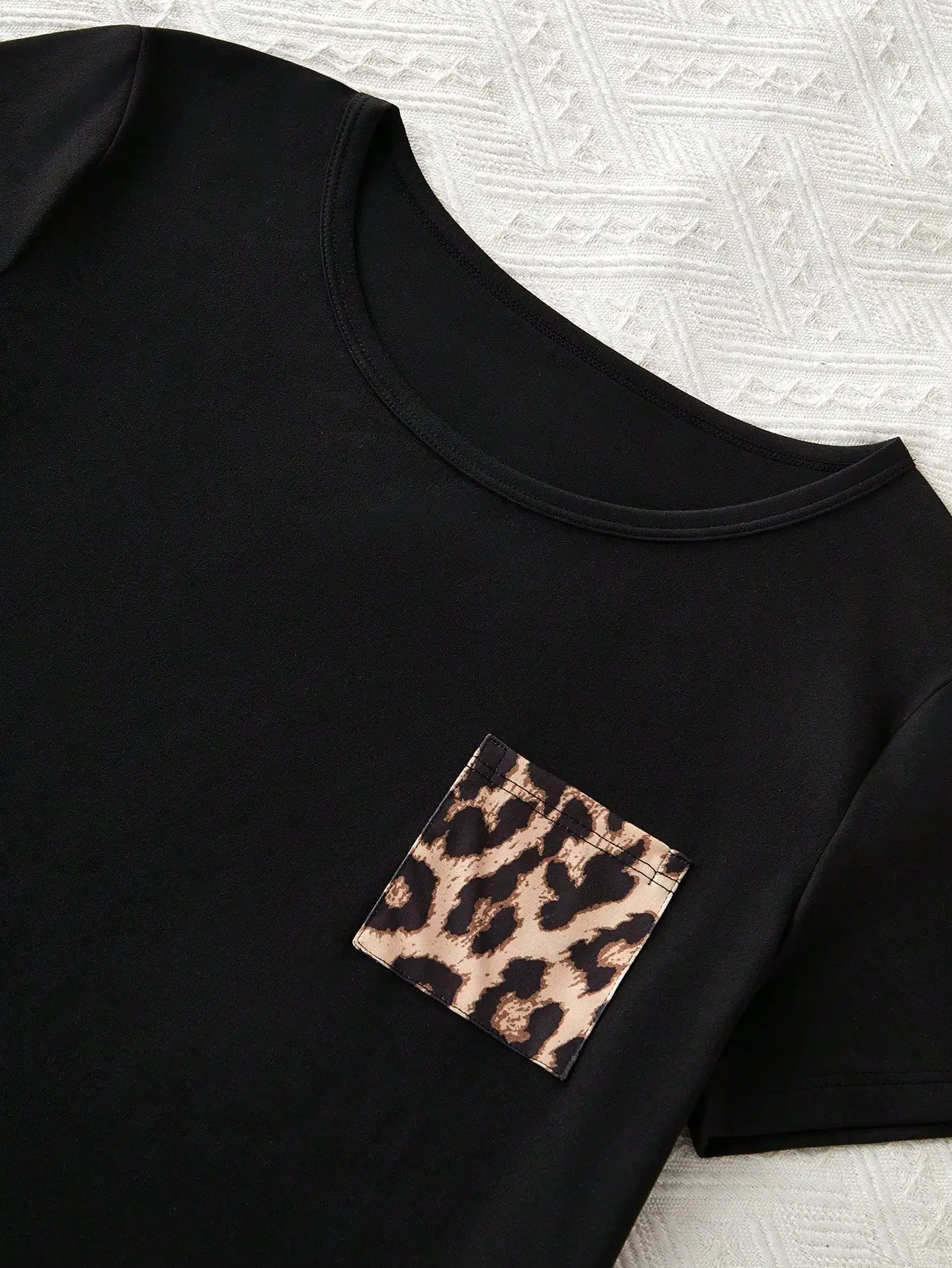 Zestaw składa się z trzech elementów: jednolitego T-shirtu z krótkim rękawem i okrągłym dekoltem, spodenek z elastycznym pasem oraz długich spodni, oba dolne elementy pokryte wzorem lamparta. Krój wszystkich części jest luźny i swobodny, a naszywana kieszonka na piersi T-shirtu nawiązuje do printu dolnych części.